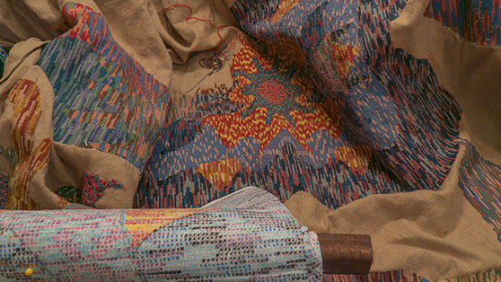 Photo by Teresa Maluenga, showing the sketch plans and manufacturing process of Tapete de Arraiolos 2.